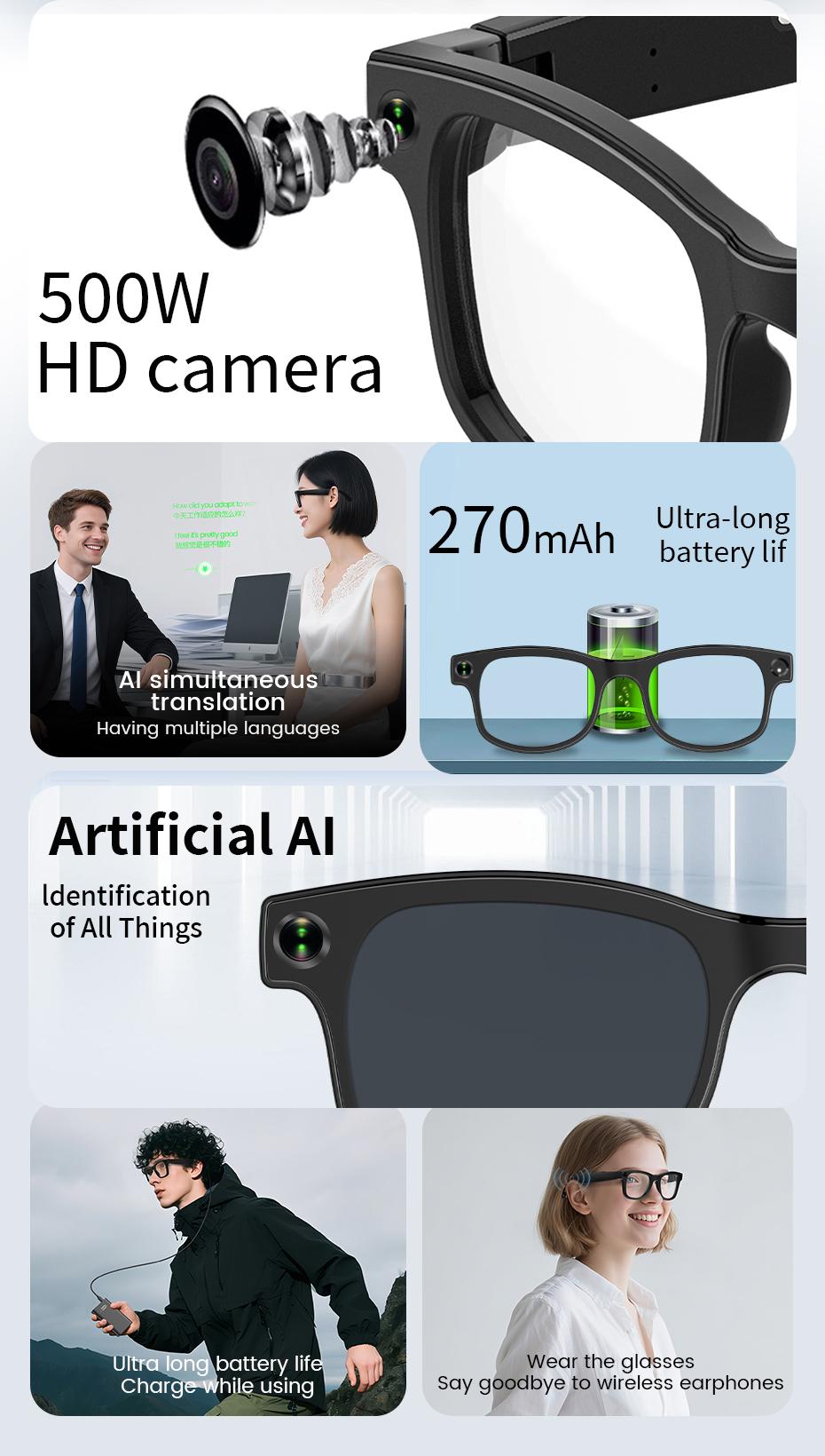 ▪Equipped with a -new 500w ultra-wide-angle camera and a dual-mic system,these glasses accurately capture everything you see and hear,Shoot high-quality photos and immersive videos.